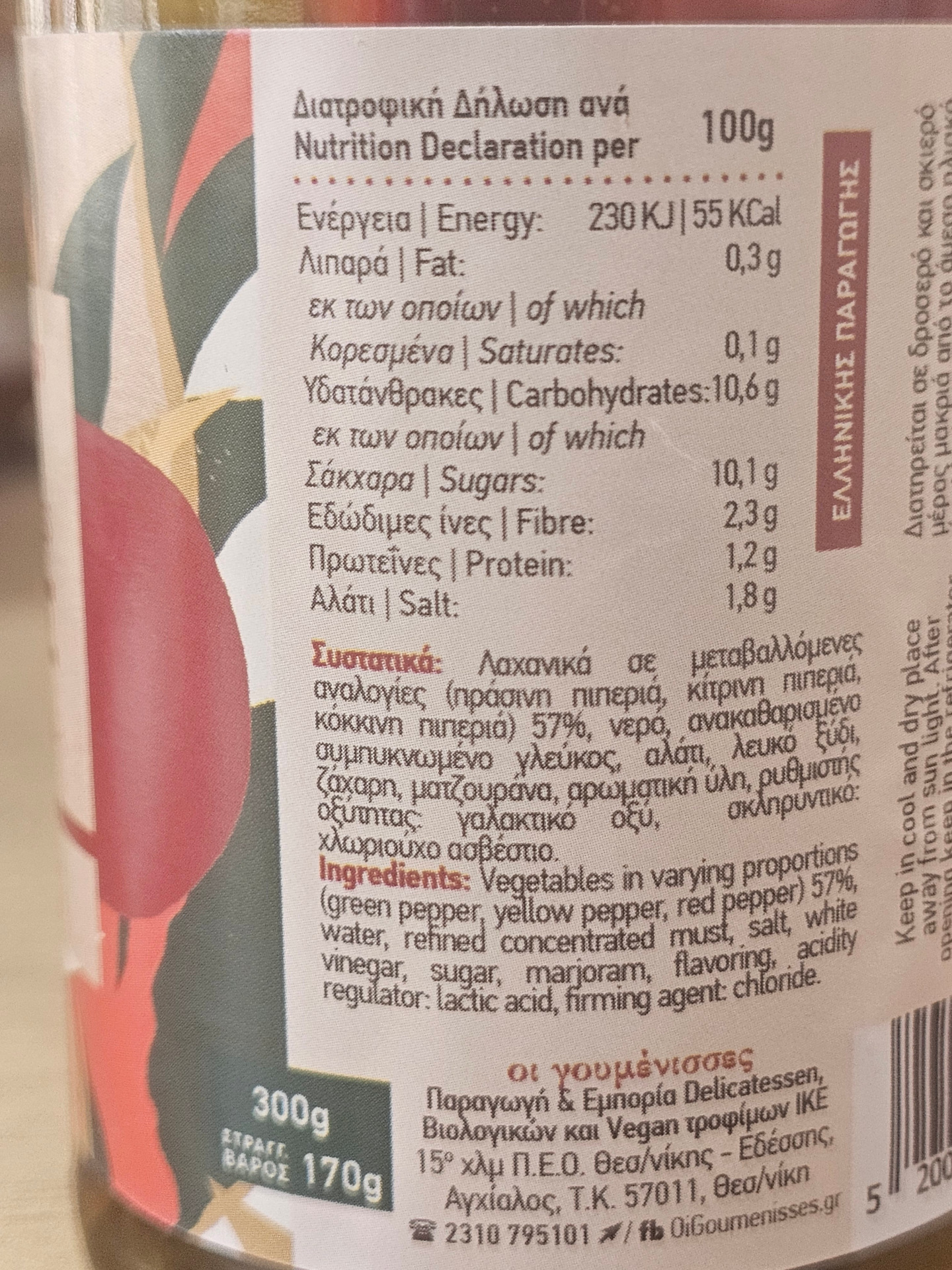 The Handmade Pickled Peppers "Oi Goumenisses" are made with a selection of green, yellow, and red peppers (57%), hand-cut and marinated in a delicate brine with white vinegar, concentrated must, sugar, marjoram, and spices.