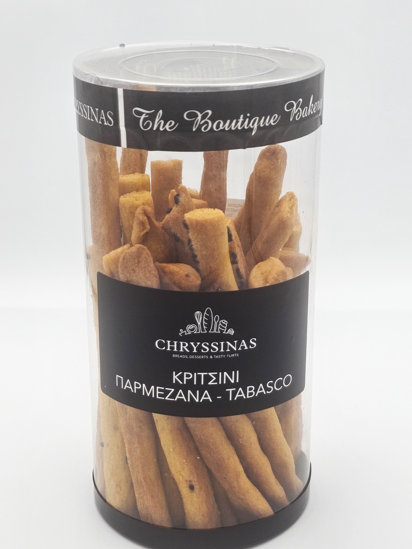 The CHRYSSINAS Parmesan & Tabasco Breadsticks bring together the rich, nutty flavor of authentic Parmesan cheese with the bold, zesty touch of Tabasco sauce — creating a perfectly balanced gourmet snack with a subtle kick.