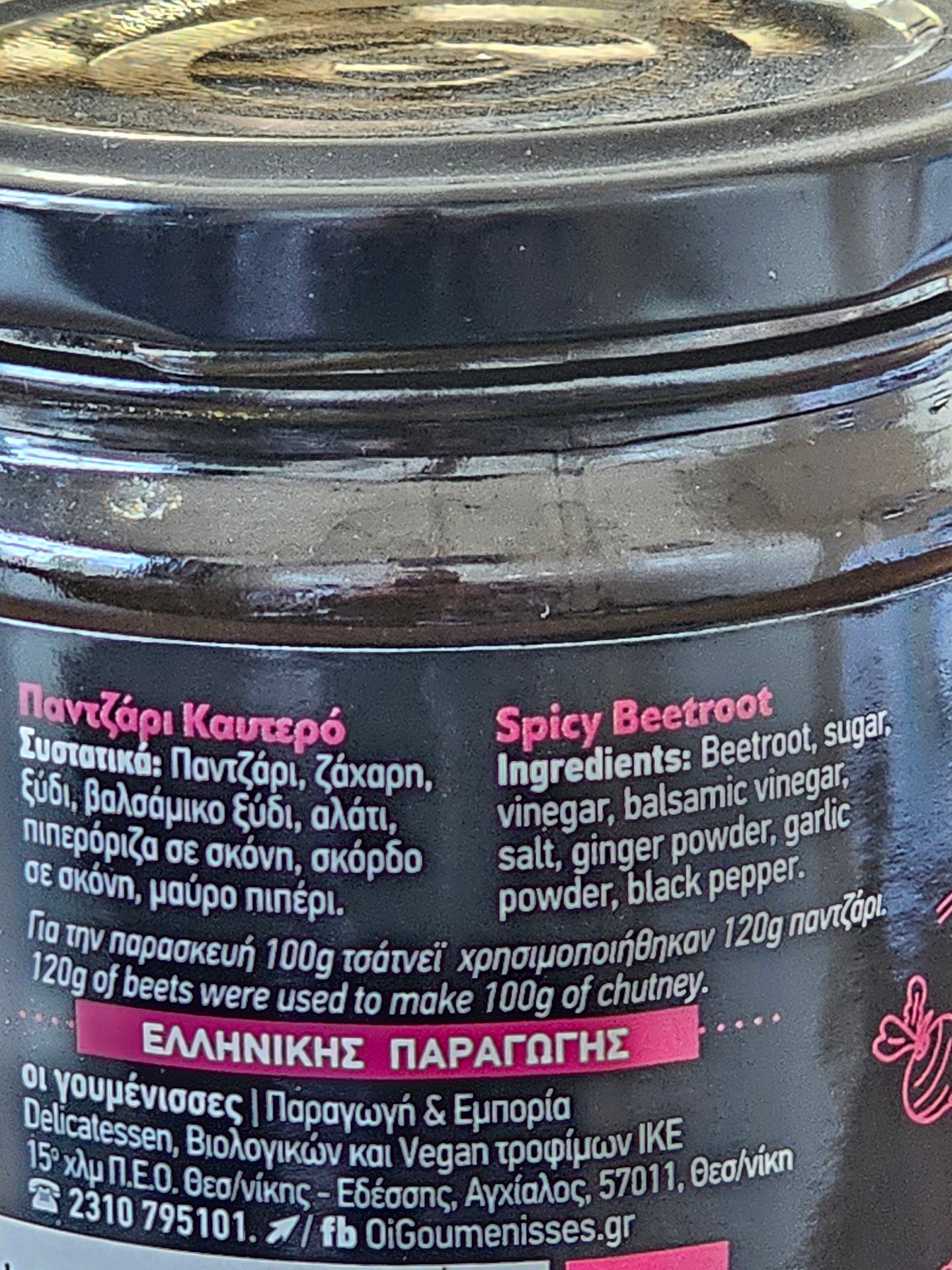 The Spicy Beetroot Chutney "Oi Goumenisses" is a handmade relish of rich color and complex flavor, combining the natural sweetness of beetroot with the tang of vinegar and the warmth of ginger and black pepper.