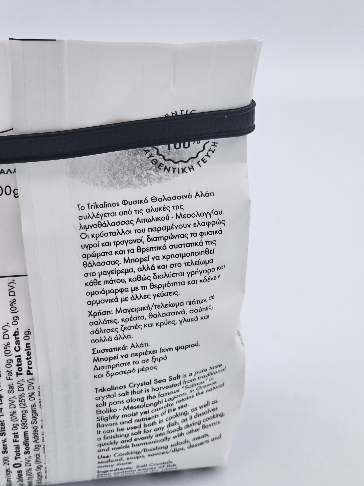 The Trikalinos Natural Sea Salt is hand-harvested from the traditional salt pans of the Aetoliko–Messolonghi lagoon in Greece.