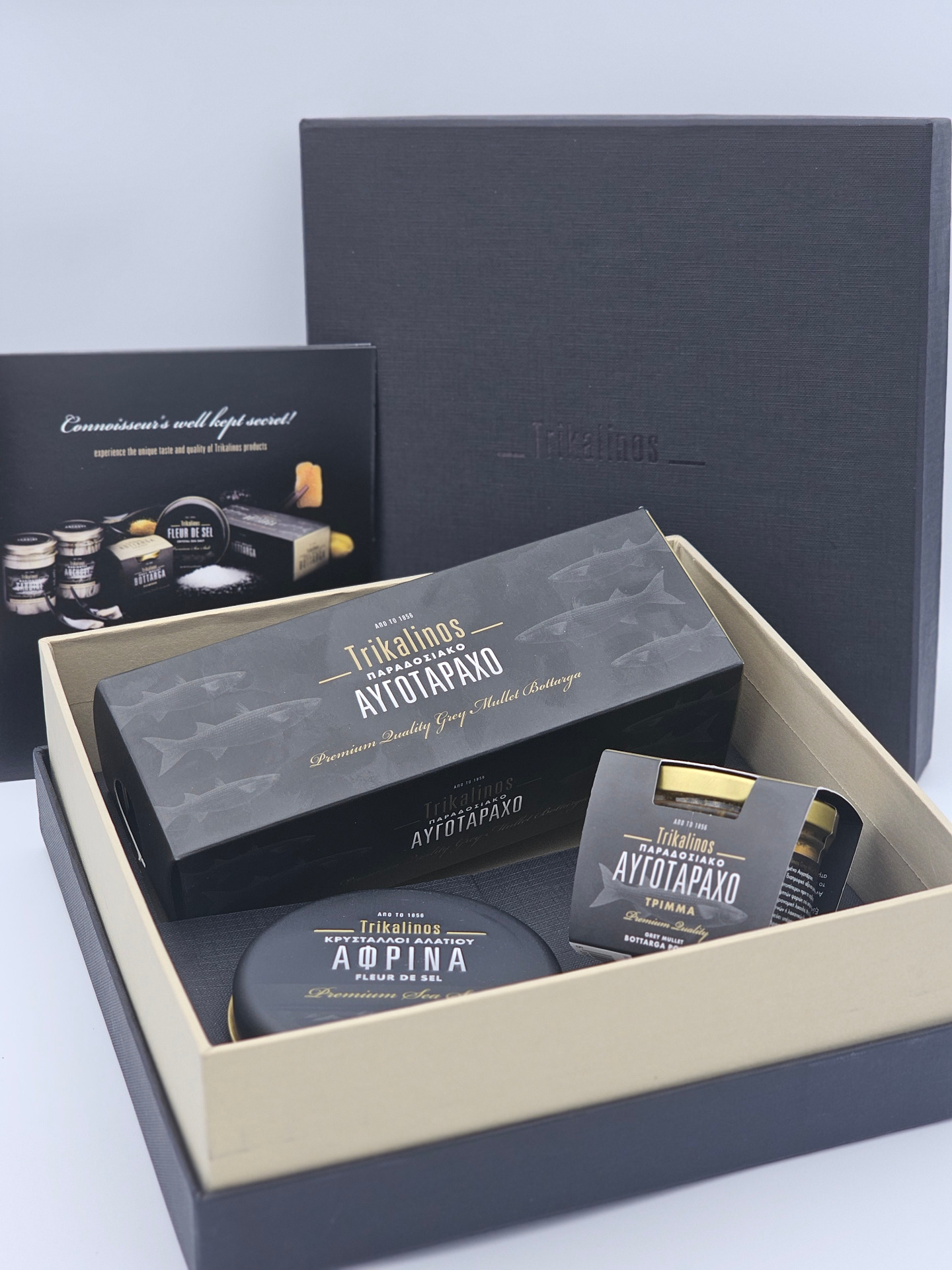 It includes the renowned Traditional Trikalinos Grey Mullet Bottarga, the Bottarga Powder, and the exceptional Fleur de Sel Sea Salt Crystals, beautifully presented in an elegant black gift box.